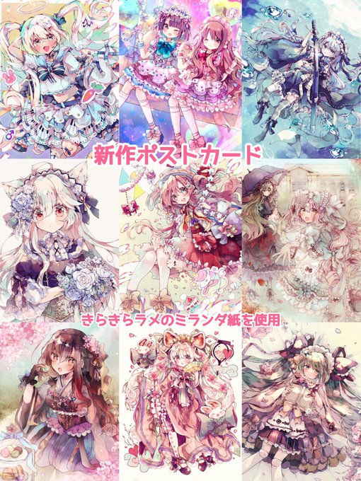 🎀#少女アリスのあこがれmini 🌟9/17(土)…追加納品予定🌟 新作 ▫️ポストカード(9種)/各¥200(税抜) きらきらラメのミランダ紙を使用した、 豪華で可愛いポストカードです✨ ポストカードでは初めての絵柄です! *i-COL様1周年記念イラストは、 展示販売のご許可を頂いております