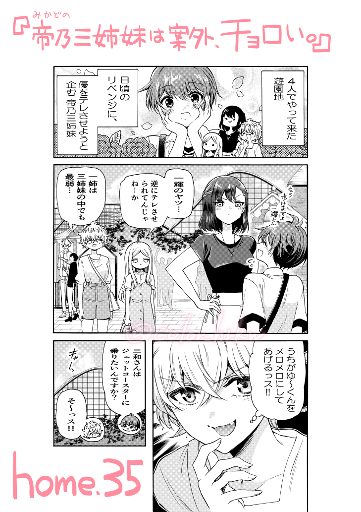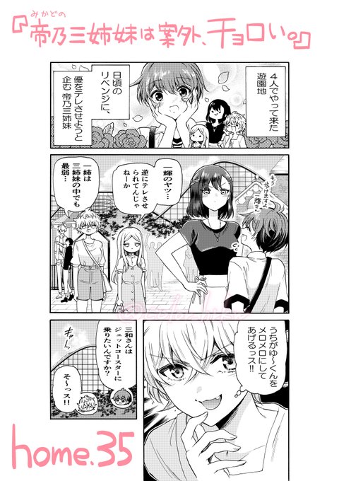 本日発売の #少年サンデー に、『帝乃三姉妹は案外、チョロい。』の35話目が載っています! 引き続き遊園地編です🎡 三姉妹による、優 テレさせ計画も続行中! 今週も、お読み頂けたら嬉しいです😌 #帝乃三姉妹は案外チョロい