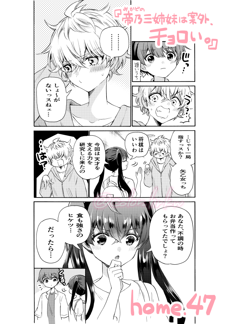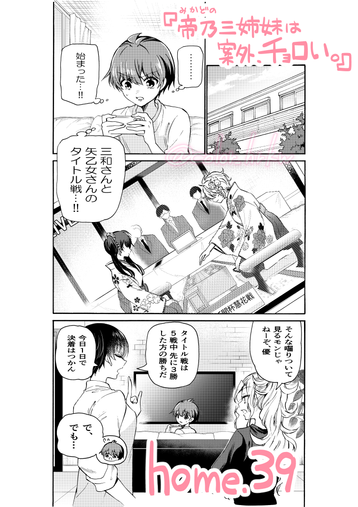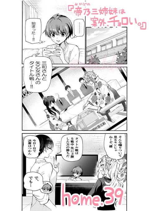 本日発売の #少年サンデー に『帝乃三姉妹は案外、チョロい。』の39話目が載っています! 引き続き三女・三和編👘 将棋のタイトル戦に挑む三和を励ますために、優と姉たちが奮闘しています! 今週はカラーも描かせて頂きましたので、一緒に見てもらえたら嬉しいです🎨✨ #帝乃三姉妹は案外チョロい