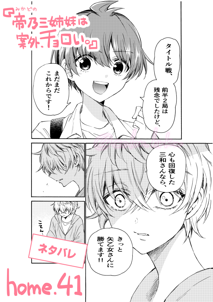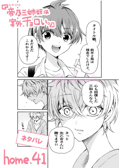 本日発売の #少年サンデー に『帝乃三姉妹は案外、チョロい。』の45話目が載っています! 三和と桜のタイトル戦、ついに決着の時!! そして、優と三和は 驚きの行動に…? 今週も お読み頂けたら嬉しいです😌 #帝乃三姉妹は案外チョロい