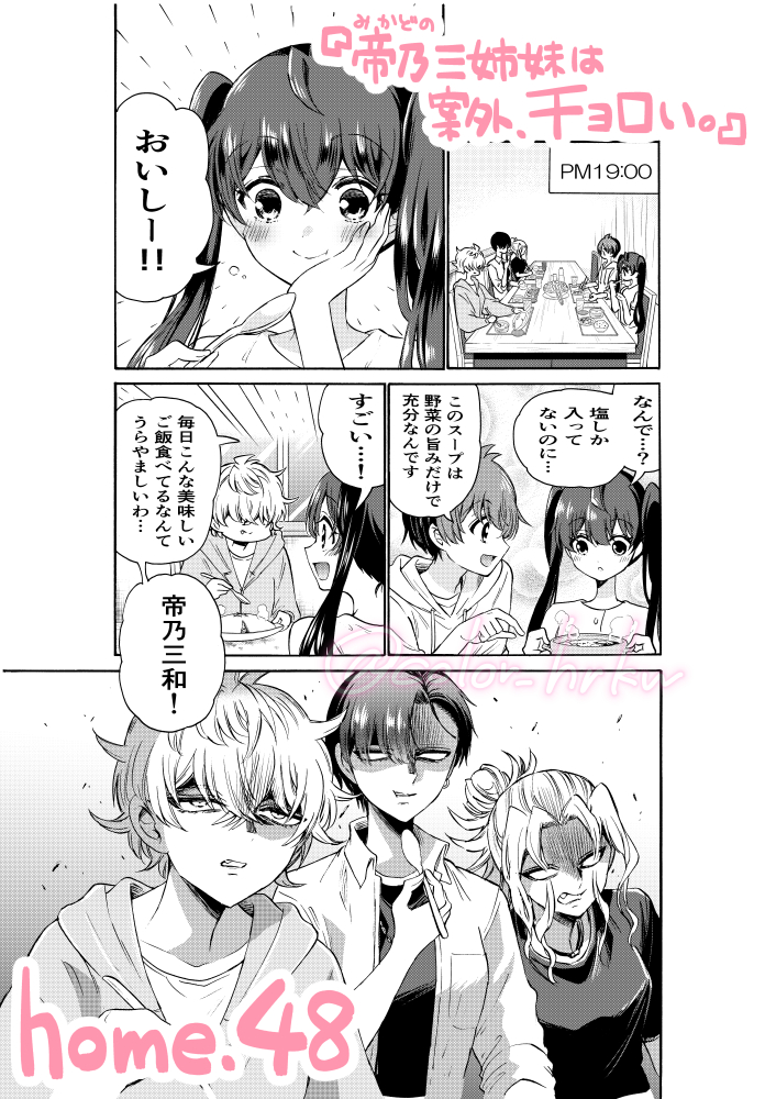 本日発売の #少年サンデー に『帝乃三姉妹は案外、チョロい。』の56話目が載っています! 帝乃パパとの食事会後編🍽️ ちょっと気まずいこの状況を、優と三姉妹は どう切り抜けるのか…? 今週もお読み頂けたら嬉しいです😌 #帝乃三姉妹は案外チョロい