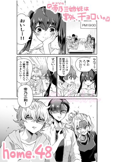 本日発売の #少年サンデー に『帝乃三姉妹は案外、チョロい。』の50話目が載っています! 引き続き、桜 帝乃家へのお泊まり編🏡 今回は 三女・三和の部屋でガールズトークです。 今週も、お読み頂けたら嬉しいです😌 #帝乃三姉妹は案外チョロい