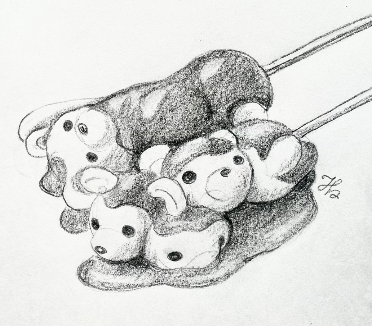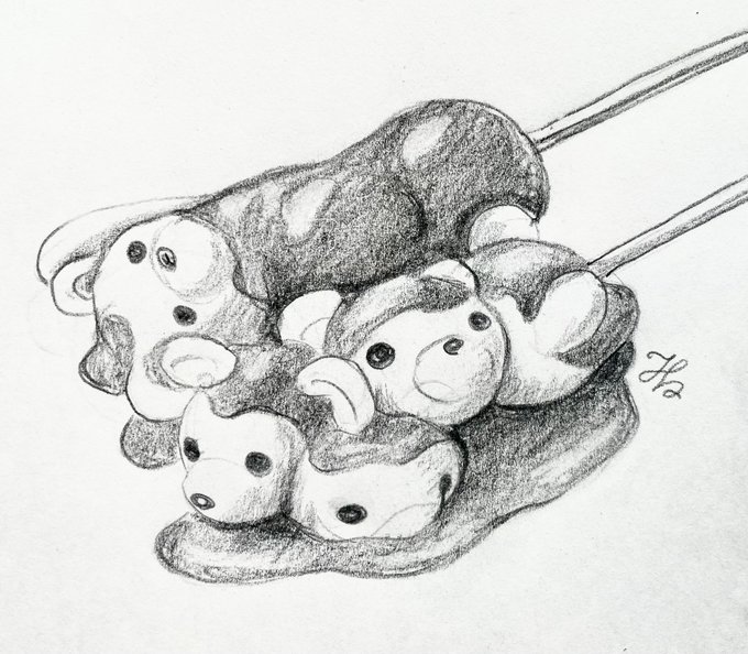 今日、京都は昨日より最高気温が5度も高く、ポカポカ陽気…という天気予報でしたが。曇りだし風は強いしで、春の気配がしません。いや、春一番なのかな? #drawing #鉛筆画 #art #アート #illustration #イラスト #絵描きさんと繋がりたい #みたらし団子 #みたらしだんごの日 #山崎製パン #mitarashi