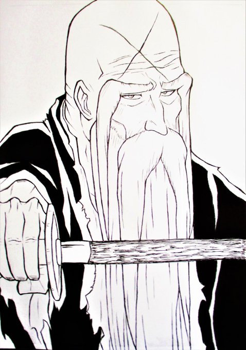 BLEACHの山本元柳斎重國の線画(ペン入れ)、 ベタ塗りです🖋 後日、色塗り予定です😌 #BLEACH #山本元柳斎重國 #アナログ #イラスト #絵描きさんと繋がりたい #illustration