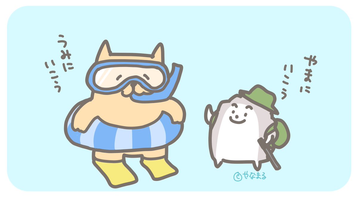 今日は「#海開き」「#山開き」の日ですよ♪ 海のよさ、山のよさをプレゼン中のふたり。 どっちに行こうかな? #イラスト #今日は何の日 #絵描きさんと繋がりたい #イラスト好きさんと繋がりたい #ゆるいイラスト #illustration