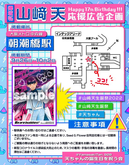 🌸🐢山﨑天ちゃん応援広告🐢🌸 本日9/26から、丸善インテックアリーナの最寄駅【大阪メトロ中央線 朝潮橋駅】に天ちゃんの応援広告を掲載させていただきます! 見つけた方は下のタグと共に呟いていただけると嬉しいです☺️ #山﨑天生誕祭 #山﨑天応援広告 ⚠️駅係員へのお問い合わせはご遠慮ください twitter.com/chacapocopom/s…
