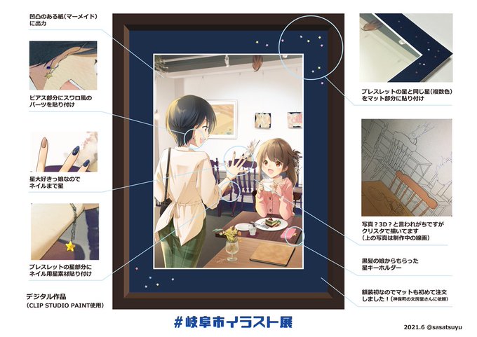 改めまして #岐阜市イラスト展2022 ありがとうございました。 馴染み店さんに飾ってもらってたイラストも掛け替えたことだし去年の岐阜市展作品通販しよかな?🤔 twitter.com/sasatsuyu/stat…