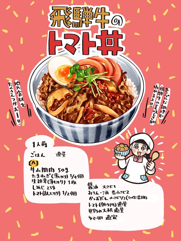 いらっしゃい! 今日の日替わりどんぶりは、#岐阜 の「飛騨牛のトマト丼」だよ。 野菜を美味しくたくさんとれる牛丼に仕上げました! 具材にトマトを使っているから、あっさりした味わいでご飯も進むよ。 #どんぶり食堂 #農家の皆さんありがとう