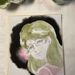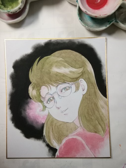 #岡崎つぐお彩色イラスト色紙 三枚目、彩色完了。 (因みにこのリクエストキャラクターは…プロデビュー後第一作の読み切り作品「恋のWスティール」ヒロインの辻岡 陽子です。作中には無いシチュエーションの特注品になります) 本日はここまで…!
