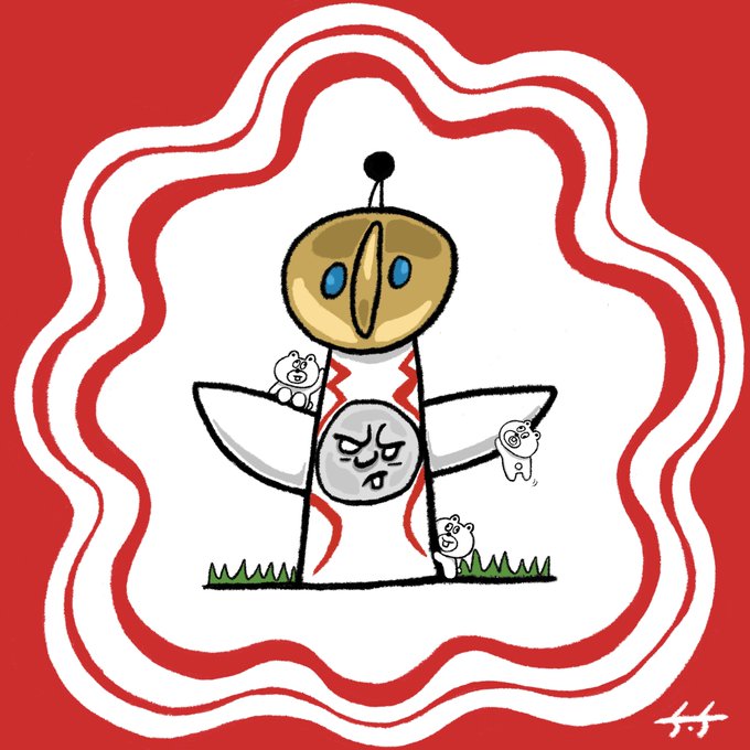 【告知】 発売中の小学館入門百科シリーズ『タローマンなんだこれは入門』で何点かイラスト描かせていただいています〜。よろしくお願いします! これは当時アメリカにも輸出していたであろうタローマンの想像落書きです。 amzn.to/3CS43Hu #タローマンなんだこれは入門 #岡本太郎 #藤井亮