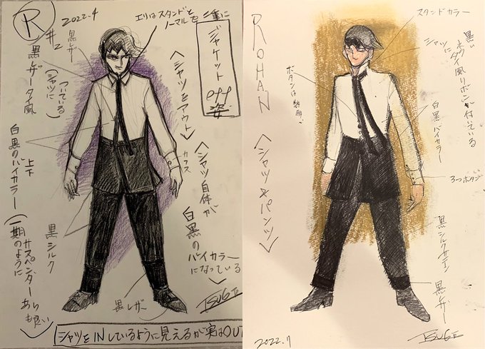 多くの取材をありがとうございます。メディアに使用されている露伴デザイン画は非常に似ている2種類があります。見比べていただくと細部が異なりますので面白いかと思います。左が最初期案。右が最終版です。(柘植) #岸辺露伴ルーヴルへ行く #髙橋一生