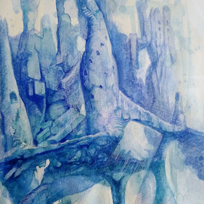 薔薇の塔(Tower of roses) 峠、遺跡、巨石、何に使われたかわからないのもの。 #art #watercolor #透明水彩 #青 #art #blue #峠 #イラスト #illustration #Remains #Ruins #遺跡 #シュールリアリズム #surrealism #絵画 #contemporarydrawing #花 #flower #磐座 #薔薇 #rose #塔 #tower