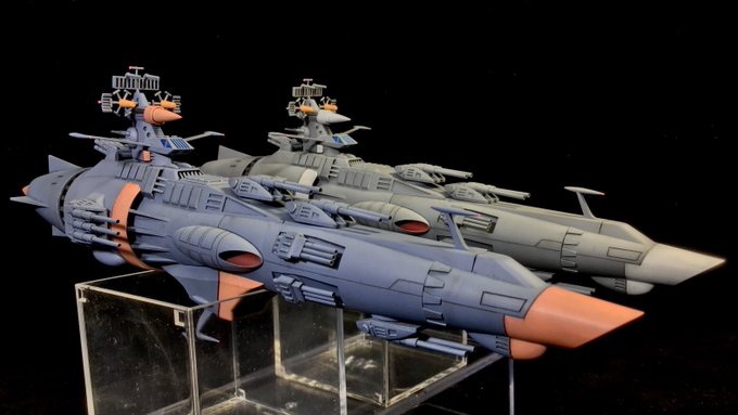 #宇宙戦艦ヤマト の #巡洋艦 完成しました。#Fusion360 でモデリング、#Satrun2 でSK水洗いレジンでの印刷です。全パーツ接着無しで組み上がります。1隻は設定に似たカラー、もう1隻は無人艦隊カラーをイメージして塗ってみました。(続く) twitter.com/i/web/status/1…