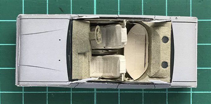 #高速有鉛デラックス 誌の #ペーパーモデル を1/64スケールに変更した #マツダペルソナ TYPE-A。5速マニュアル仕様のため運転席アームレスト無し。アームレストクッションも無しの作り分け。リアラウンジソファーシートの再現に苦慮しました。 #ペーパークラフト #papercraft #工作所以