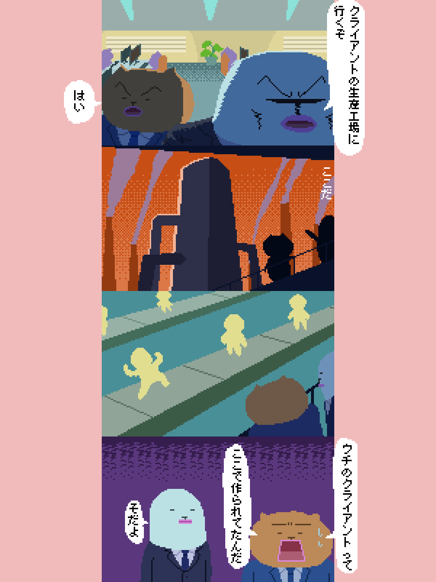 ドット絵 4コマ漫画 ぴくせるラッコ 「現場視察」 #漫画が読めるハッシュタグ #ゆるいイラスト #ゆるかわ #pixelart #PixelManga #みんなで楽しむTwitter展覧会 #工場