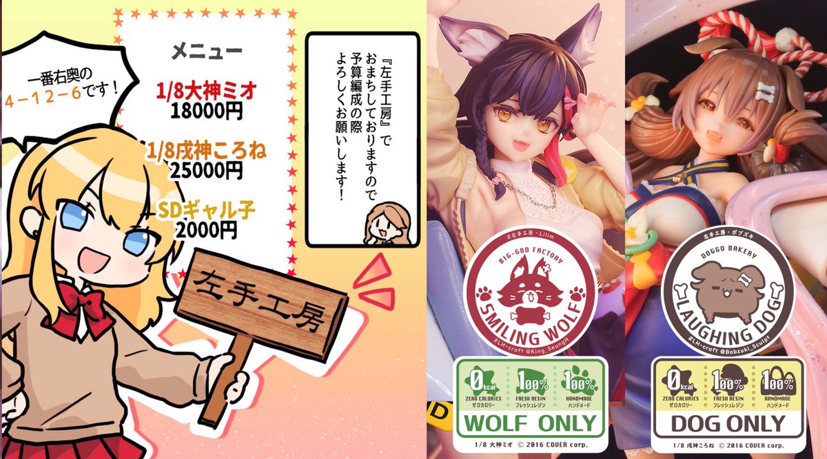 #左手工房 #wf2023w #ワンフェス2023W 出発まで8日!(多分)! もうワクワクが止まりません!! 卓番4-12-06「左手工房」でお待ちしております! 販売品 -1/8「大神ミオ」 18,000円 -1/8「戌神ころね」 25,000円 -SDギャル子 2,000円 展示作 -1/7「大空スバル」 -1/7「獅白ぼたん」