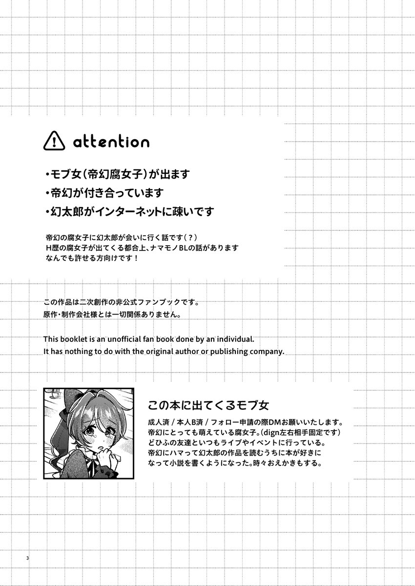 1/23ありゆめ3合わせ新刊です。 「HIDE AND SEEK」 帝幻/全年齢/B5/36p/500円 それぞれ寂しさを抱えている🎲と📚の話。🎲の幼少期を捏造しています。(1/2) pixiv→pixiv.net/artworks/95590… 通販→ecs.toranoana.jp/joshi/ec/item/… #帝幻本
