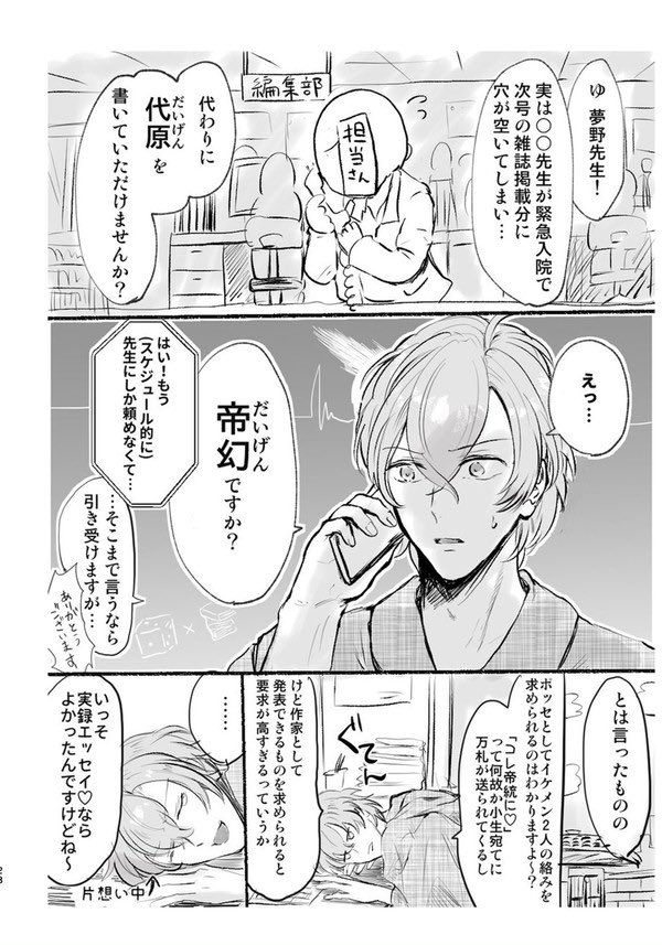 #帝幻本 1/8 CrazyLyricBattle25(インテ) 『夢野先生の恋人』A5/20p/全年齢/300円 ◆pixiv.net/artworks/10426… ◆通販🐯ec.toranoana.jp/joshi_r/ec/ite… 宜しくお願いします!!ツリーにサンプル続きます
