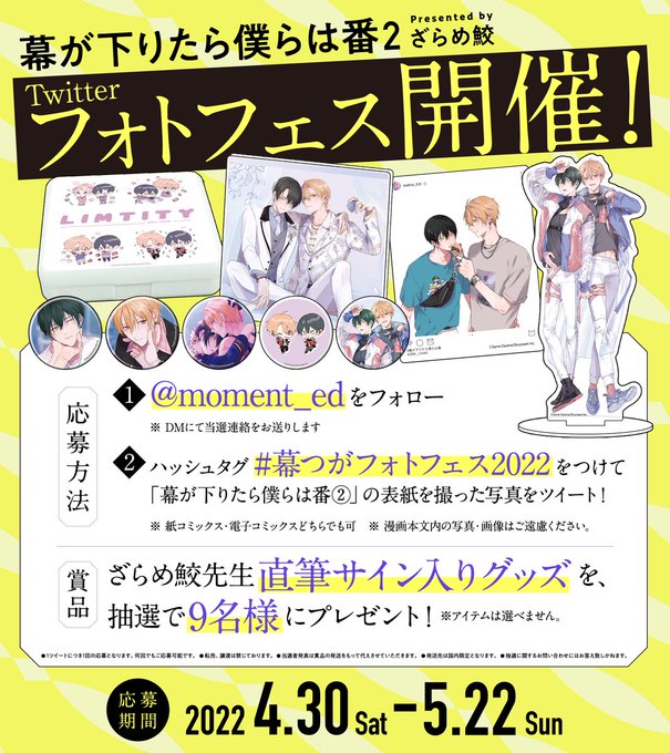 2巻の発売を記念したすぺしゃるキャンペーンが開催されます⸜💛⸝ 読者さんが撮ってくださるお写真見るのだいすきなのでぜひ参加してもらえたらうれしい🐰🫶🍯 💉応募期間~5/22まで🪫 ※お問い合わせはレーベル様へ✨ #幕つが #幕つがフォトフェス2022 #幕が下りたら僕らは番