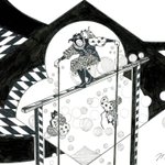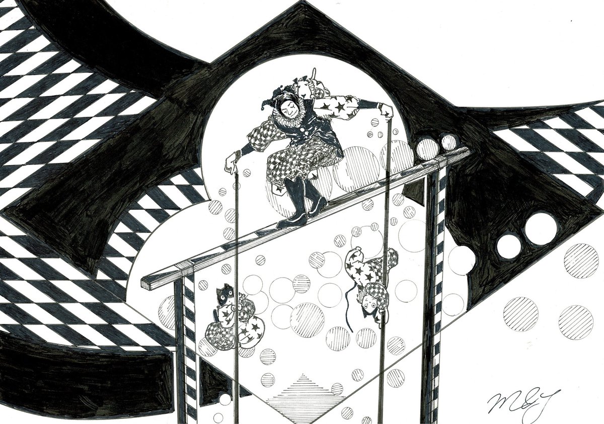 🎪🃏😸😺🐶《道化師と陽気な仲間たち》はとても高い場所に設置した平均台を歩きます👣🐾🐾🐾 #アトリエの系譜S #道化師と陽気な仲間たち #アナログ #モノクローム #オリジナルキャラクター #マンガスタイルイラスト #picturebookillustration #挿絵 #道化師 #アクロバット #平均台 #ペン画