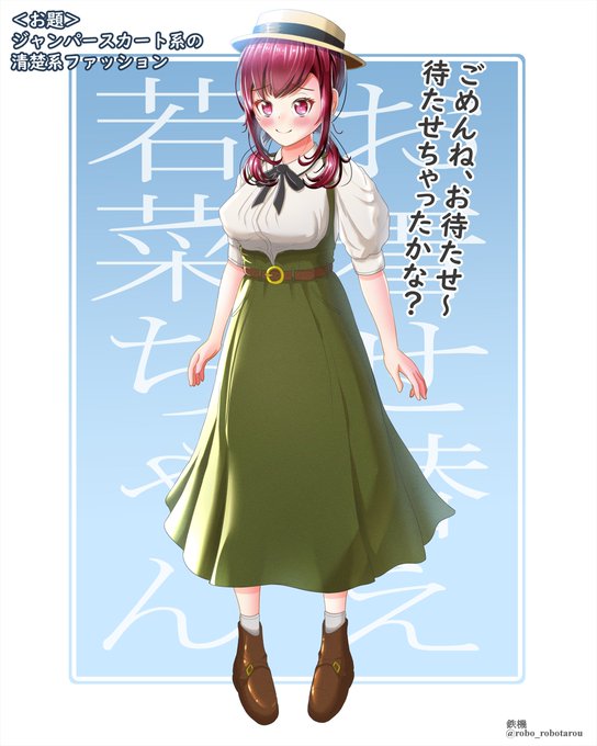 フォロワーさんから着せ替え案を募集した若菜ちゃんイラスト、次はこれを描いてみた! ■お題「ジャンパースカート&清楚系ファッション」 休日デートにどんな服を着て行こうか迷っている間に、待ち合わせ時間に少し遅れて到着してしまった若菜ちゃんの図です #うちの子 #年上幼馴染の若菜ちゃん
