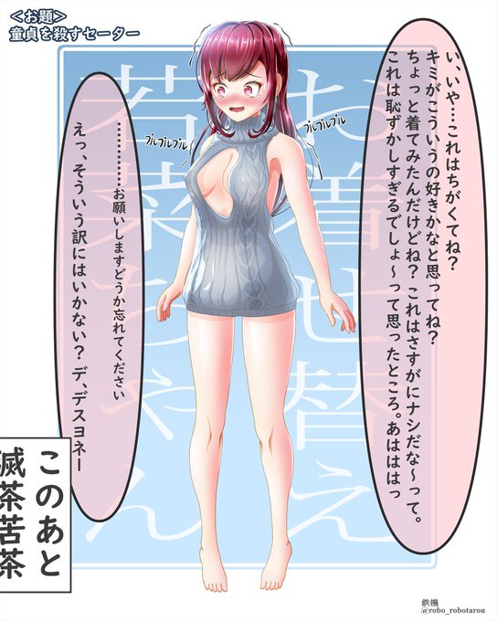 フォロワーさんから着せ替え案を募集した若菜ちゃんイラスト、次はこれを描いてみた! ■お題「童貞を〇すセーター」 若菜ちゃんがこっそり買ったセーターを自室で試しに着ていたら、彼氏くんがうっかりその場面に出くわしてしまった時の図です #うちの子 #年上幼馴染の若菜ちゃん