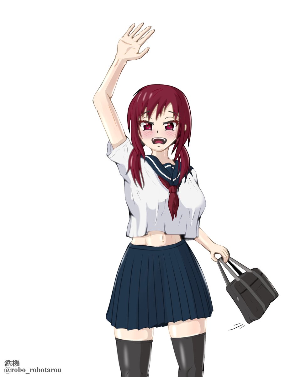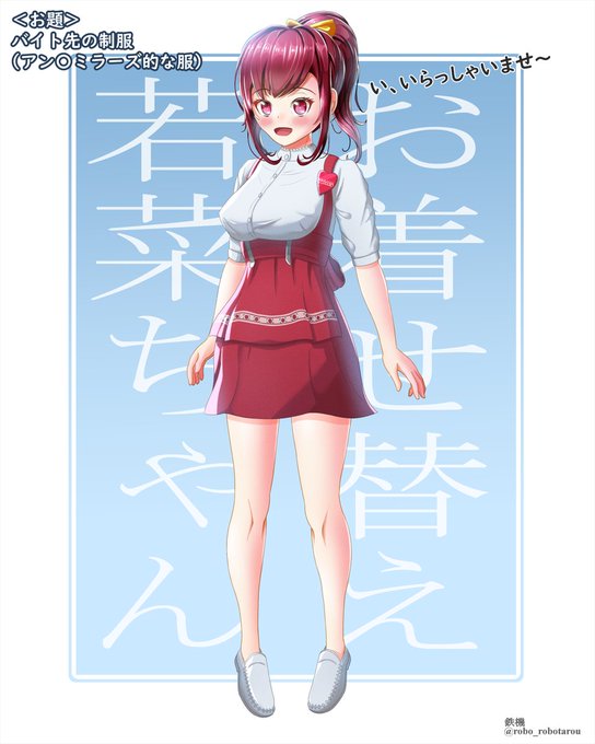 フォロワーさんから着せ替え案を募集した若菜ちゃんイラスト、次はこれを描いてみた! ■お題「バイト先の制服」 店員さんの制服が可愛いことで有名なあのファミレスの服です。スカートからすらりと伸びる脚、いいよね… #うちの子 #年上幼馴染の若菜ちゃん