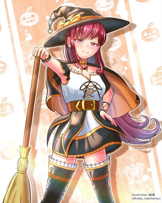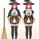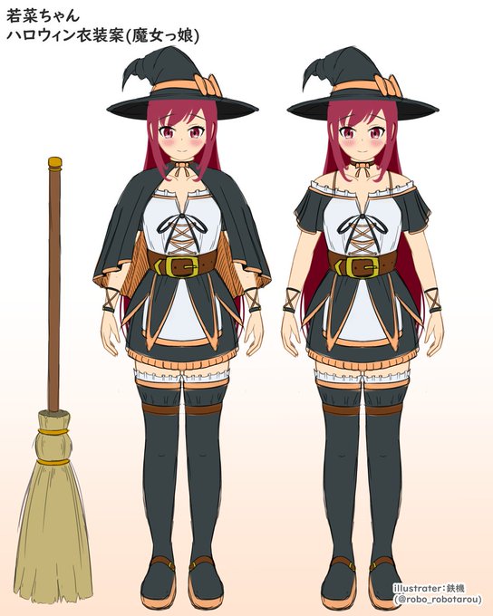 ちなみに上のイラストで若菜ちゃんが着ている衣装は、こんな感じでデザインを検討しましたね マント部分は取り外せるようになっていて、中の服はオフショルダー的な構造。この立派なホウキは若菜ちゃんが自分で古いほうきを改造した(!)小道具です #ハロウィンイラスト #年上幼馴染の若菜ちゃん