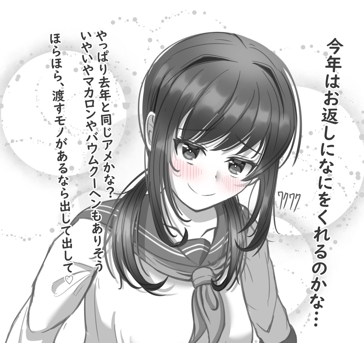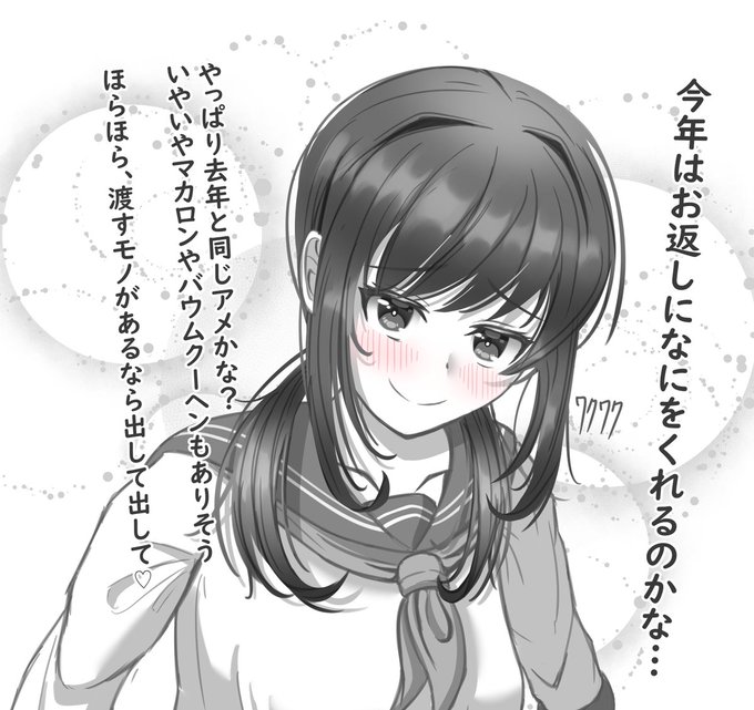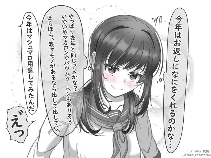ホワイトデーのお返しを予想しながら、ちょっぴり慢心している年上幼馴染ちゃんを描きました #ホワイトデーイラスト #年上幼馴染の若菜ちゃん twitter.com/robo_robotarou…