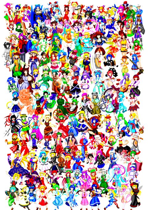 #東方Project #広島弁チルノシリーズ #お絵描き #東方絵描きさんと繋がりたい 東方全キャラチャレンジ,完成したので載せます RTや拡散されてみんなにみてもらえると嬉しいです 一番下に妖精、そこから上へ紅魔郷~虹龍洞・その他が最上という感じになっています ※旧作キャラはいません