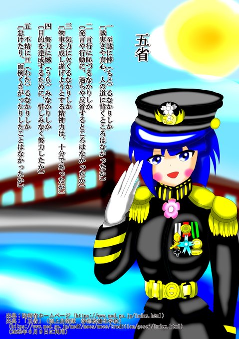 #チルノ #東方Project #広島弁チルノシリーズ 広島は海軍基地でも有名だから、軍服チルノを描きました 防衛省HPから、引用の規定に従って五省を引用させていただきました(まずいなら削除します) このツイートで私とチルノとともに、さいきょーの紳士淑女を目指そう