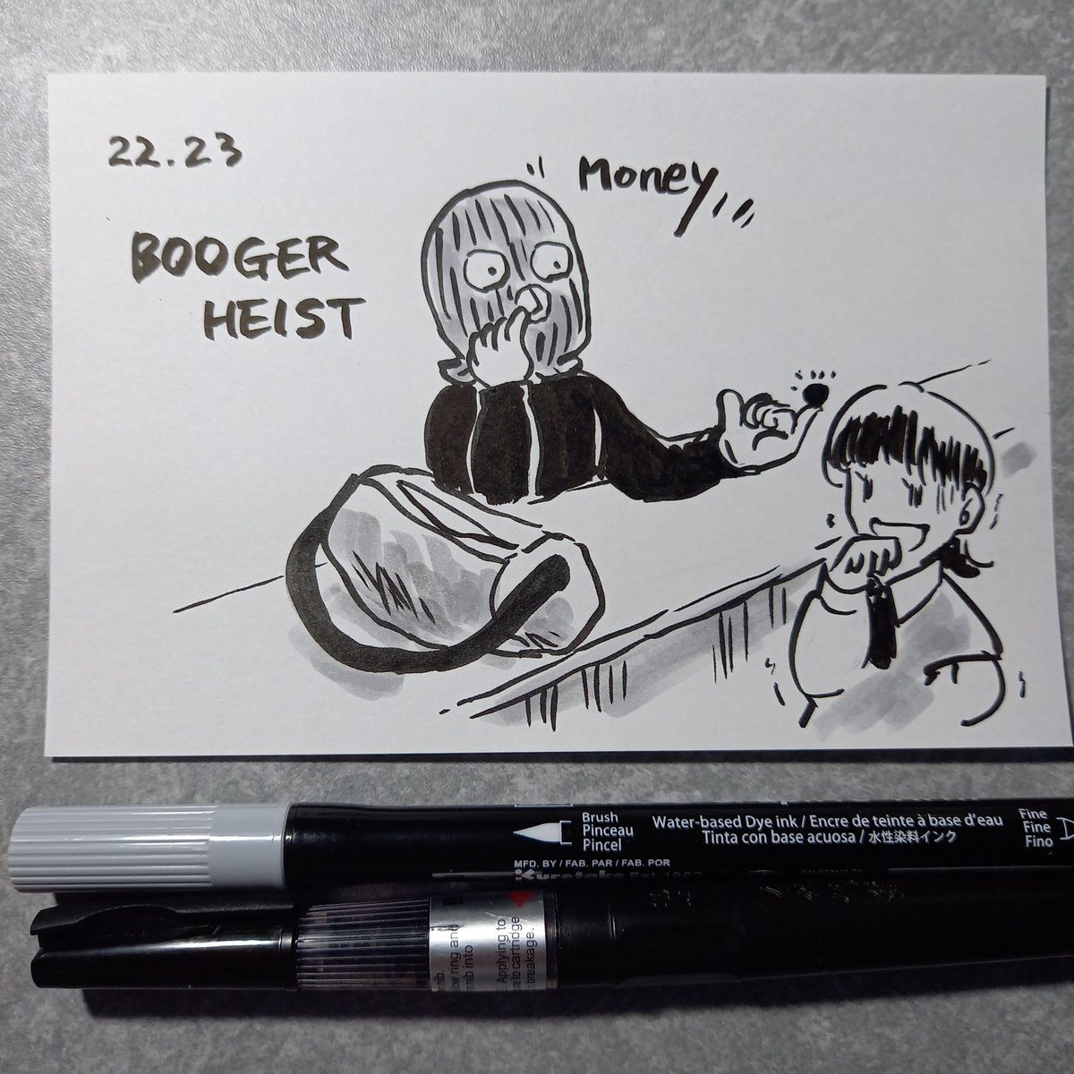 22,23.HEIST,BOOGER 『はなくそ強盗』まんまです(笑) 強盗は落語の与太郎をイメージ🤭 おねえさん、いろんな意味で怖がってますw #inktober2022 #kuretake_inktober2022 #インクトーバー2022 #booger #heist #鼻くそ #強盗 #アナログイラスト #illustration #モノクロイラスト