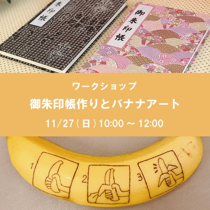 11月27日、鎌倉御朱印工房様による第三回『御朱印帳作りとバナナアート』ワークショップ開催決定。 場所は東京タワーのふもとに位置する宝珠院( @hoshuin )様。 enjoycrop.com/event-details/… 詳細は上記URLより🍌 #御朱印帳 #バナナアート