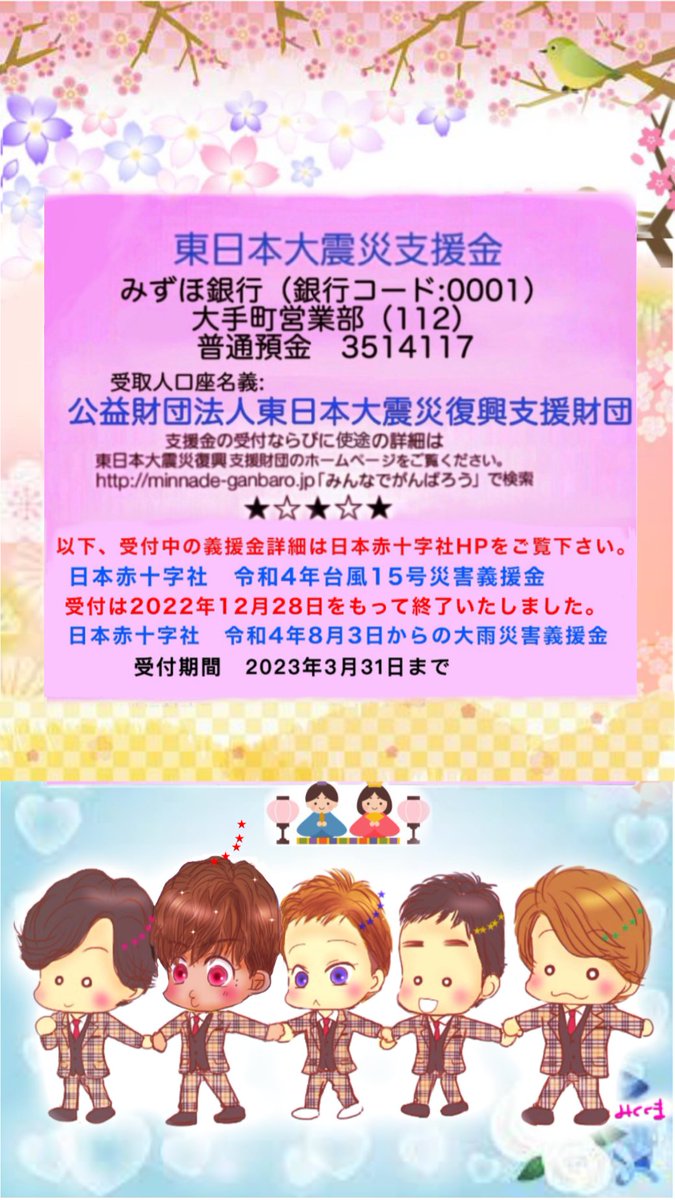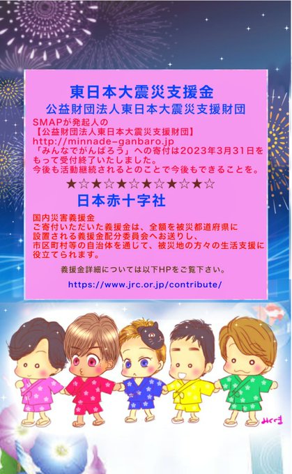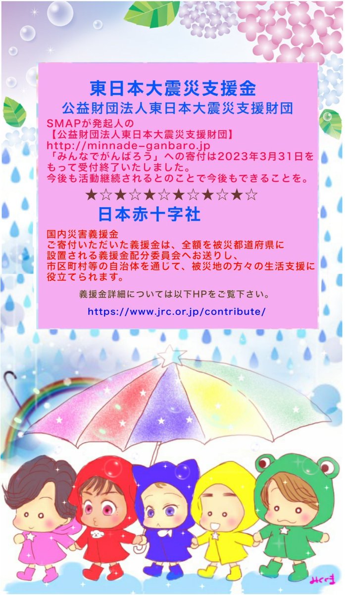 月曜22時になりました。 6月用呼びかけ画像を作成しましたので良かったらご自由にお使いください。 現在受付中の義援金は以下になります。 令和5年5月能登地方地震災害義援金 受付:2023年9月29日(金)まで jrc.or.jp/contribute/hel… #lovepocketfund #復興に向けて手を繋ごう #スマスマ