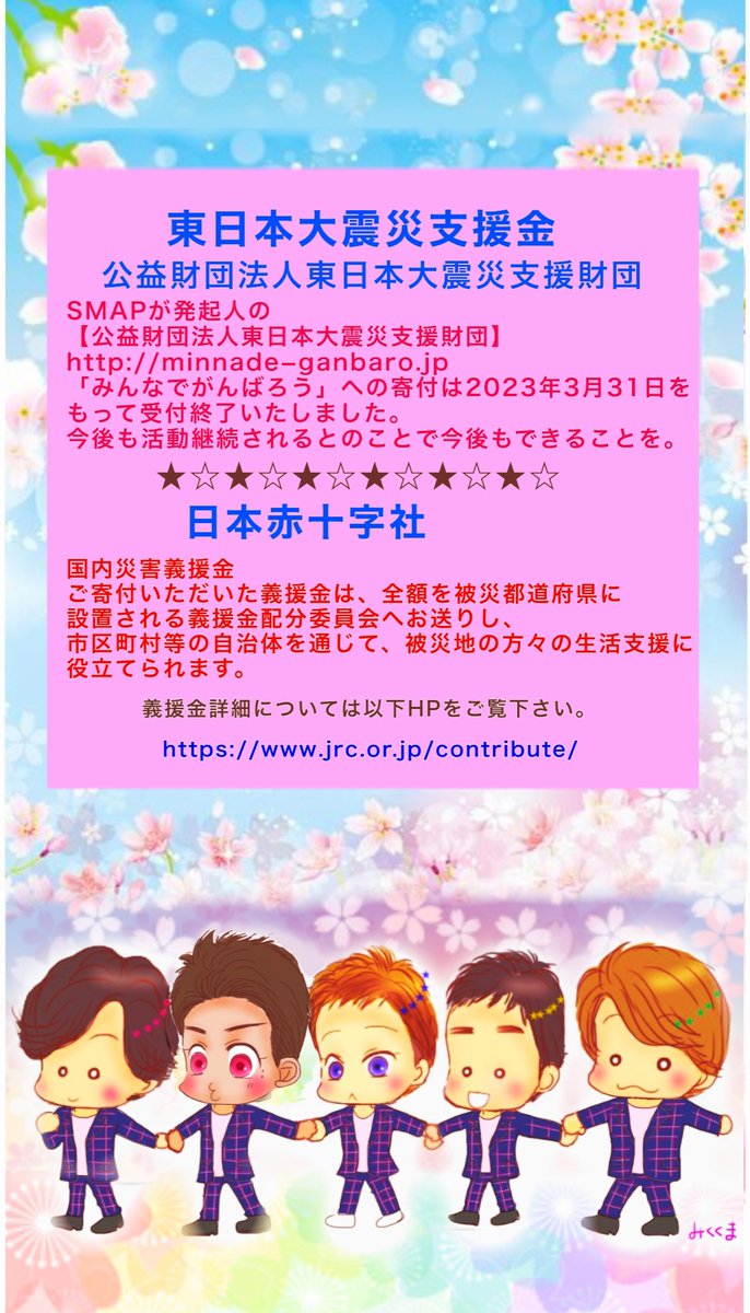 月曜22時になりました。 4月用呼びかけ画像を作成しましたので良かったらご自由にお使いください。 SMAPが発起人の東日本大震災復興支援財団の寄付は3月31日をもって受付終了しました。 その旨を1枚目に記載してます。 今後もできることを。 #lovepocketfund #復興に向けて手を繋ごう #スマスマ