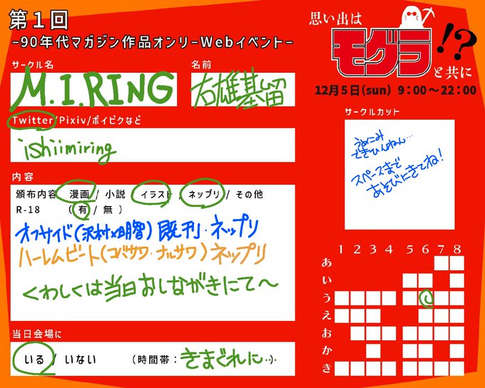 【M.I.RING】12月5日タイムスケジュール(予定!) BOOTH公開 10時00分~ (おしながき・BOOTHの商品説明の熟読をお願いします!) ハーレムビート未発表原稿公開 12時00分~ ネットプリントツイッター公開 17時00分~ タグ利用らくがき公開 随時 よろしくお願いします~!! #思い出はモグラと共に