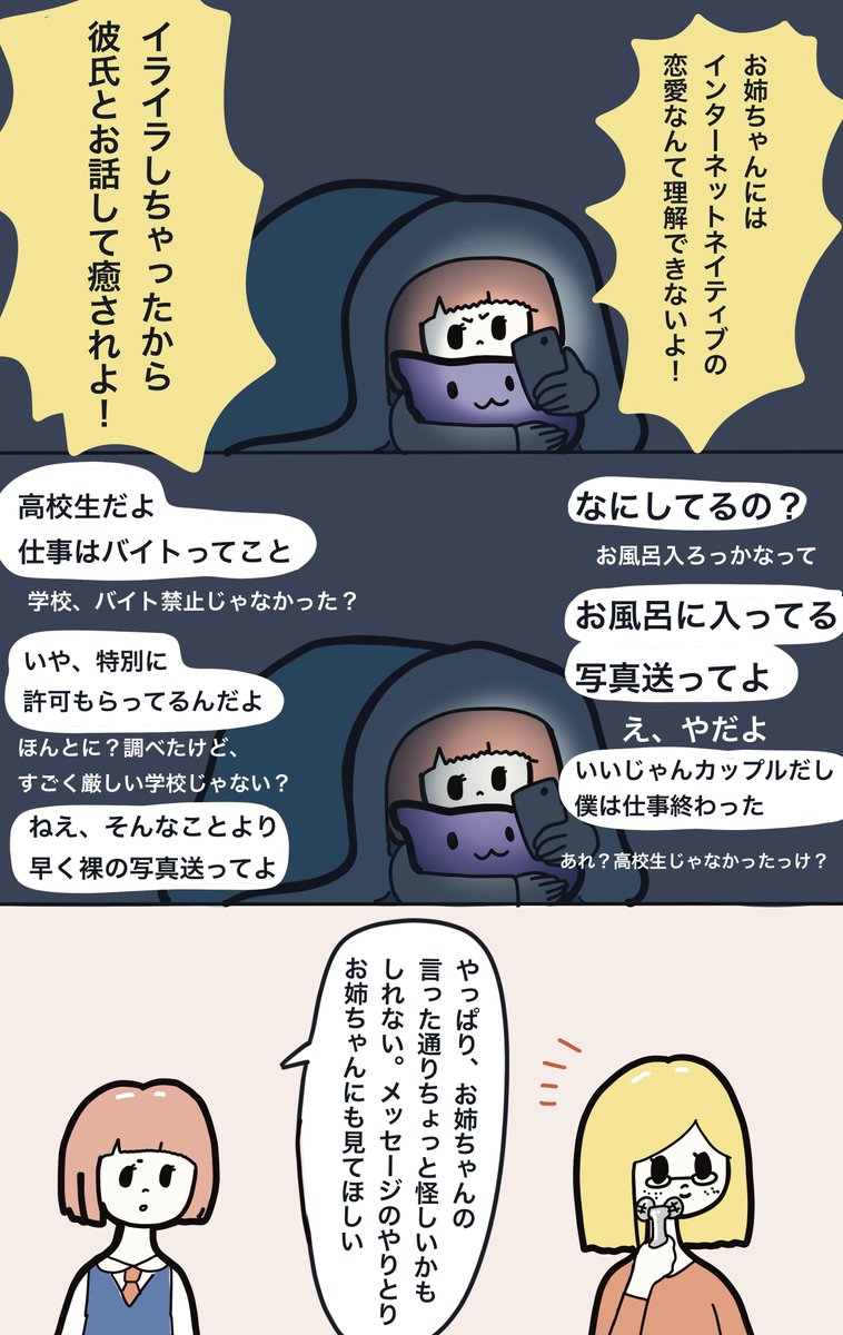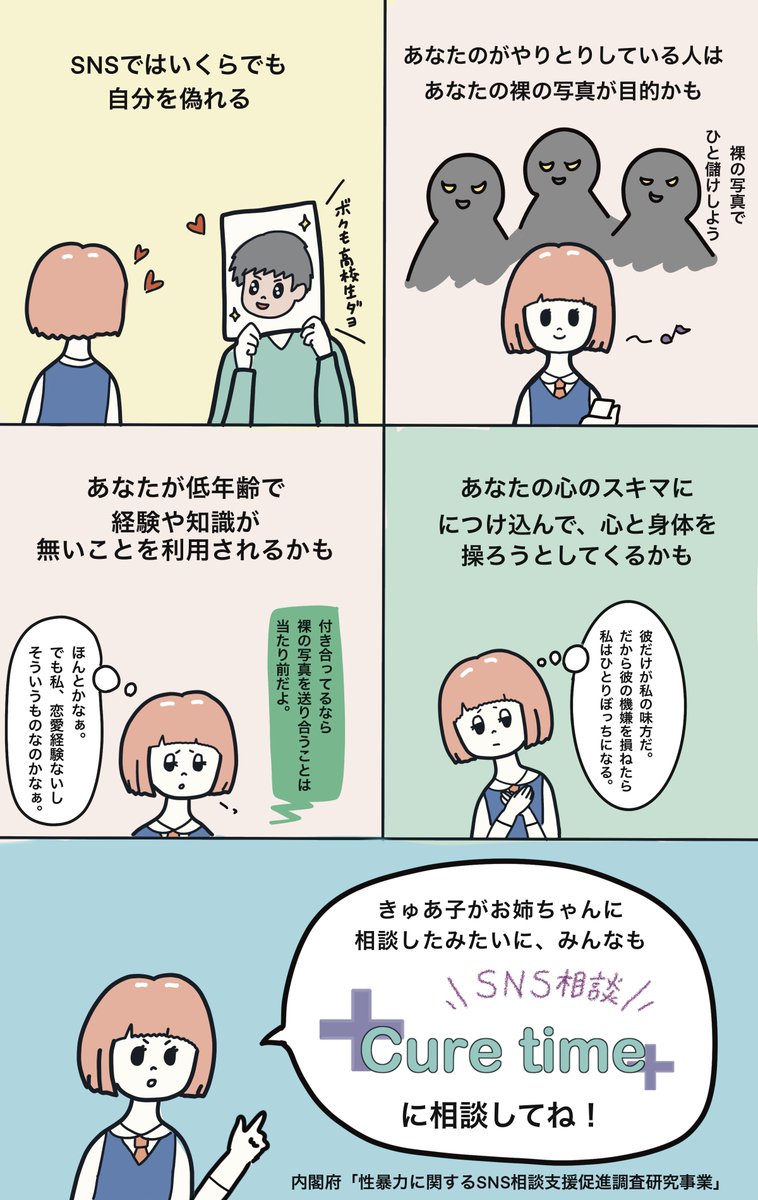 SNSから始まる恋愛でトラブルがあることを知っていますか? 写真も素敵だし、メッセージも優しくて私の事好きだって♡ でも最近、少しおかしいかも…… その人、大丈夫? #きゅあ子と性暴力を考えよう #性暴力SNS相談