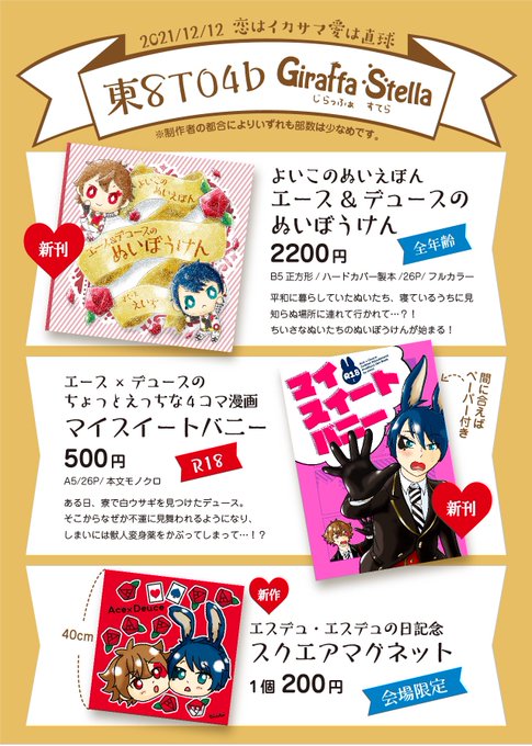 12/12 恋はイカサマ愛は直球 のお品書きです! 新刊2冊とグッズ1点を持ち込みます。 うさデュ本には当日間に合えばペーパーを付ける予定です! よろしくお願いします! ※新刊サンプルはリプ欄に続きます pixiv.net/artworks/94642… #恋はイカサマ愛は直球 #恋はイカサマ愛は直球DR2021
