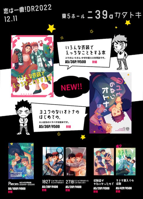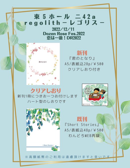 12/11 恋は一徹!DR2022のお品書きです。 東5ホール 二39b「shikaranda」で参加します! 新刊合同誌、既刊合同誌(再版)、極わずかですが⑥さん既刊の北一アンソロもあります。 あとミニカイロを無料配布します。 よろしくお願いします~! pixiv.net/artworks/10344… #恋は一徹DR2022