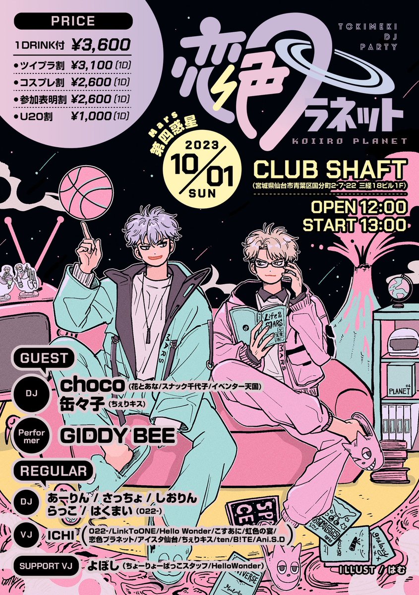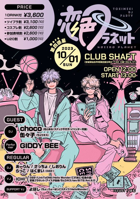 イケメンコンテンツ中心ときめきDJパーティー💘 ˚*.꒰ 恋色プラネット🪐第四惑星 ꒱.*˚ 2023/10/01(Sun.) 13:00 START @宮城県仙台市 CLUB SHAFT フライヤー&ツイプラ公開🚀𓈒𓂂𓏸 twipla.jp/events/563293 とっっても可愛い💕フライヤーイラストは、はむさん@No86ham 作です ➳💜 #恋プラ