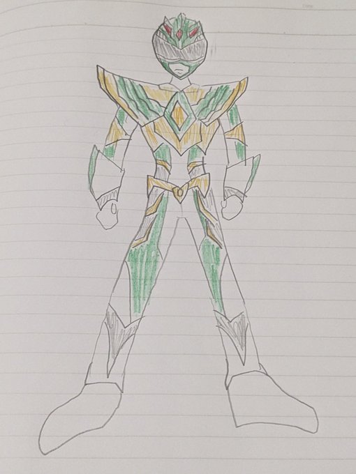 今日の朝描きました。 ブライ「トミーあとは俺に任せてくれ…行くぞ!」 ネオドラゴンレンジャーブライ パワーレンジャーのピンチに駆けつけたブライが変身した姿。 #パワーレンジャー #恐竜戦隊ジュウレンジャー