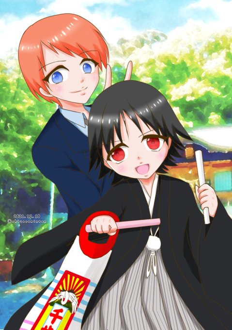 #悠人BDカウントダウンアルバム #悠人BDまであと11日 ⚠️年齢操作、捏造注意 悠人五歳おめでとう🎉 五歳のお祝いの七五三を描かせていただきました! 悠人「隼人〜何してるの?」 隼人「強くなるおまじないだよ」