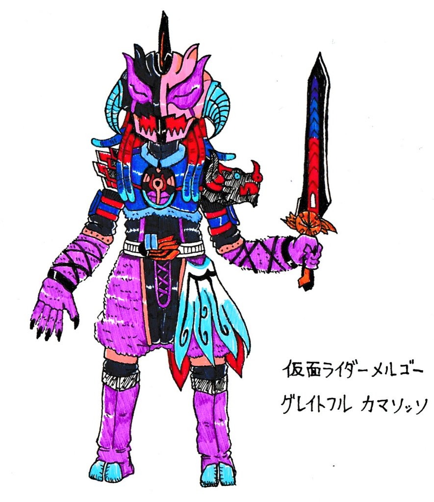 仮面ライダーメルゴー グレイトフルカマソッソのこだわりポイント ・ドレッドヘアスタイルはカマソッソのカラーをイメージ ・肩アーマーは、ビーストⅠのカマソッソをイメージ ・腰布はカマソッソの翼をイメージ #うちの子 #イラスト #オリジナルライダー #悪魔メルゴーのヤヴァい日常