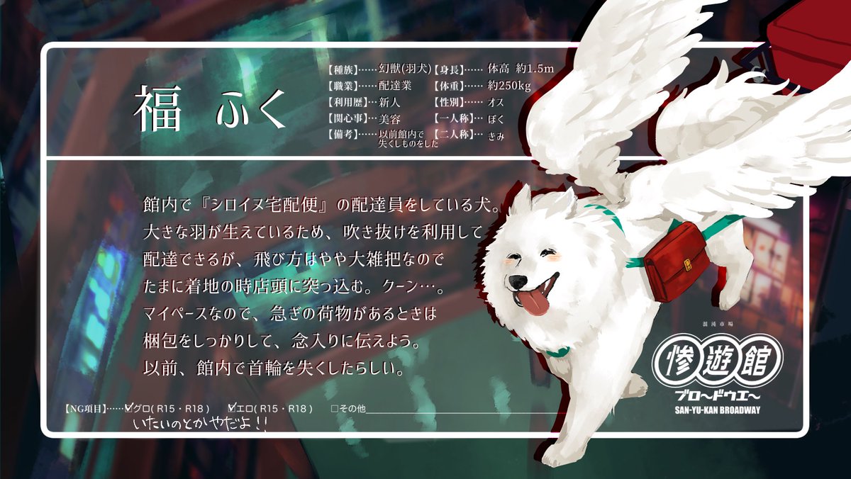 惨遊感ブロ〜ドウエ〜(@san_yu_kan_BW )に参加させて頂きます。 でっかい犬の配達員です。 動きはかなりのんびりになると思いますが、犬はいつでも館内を飛んでいます。ゆるゆると宜しくお願いします! #惨遊館ブロ〜ドウエ〜_CS