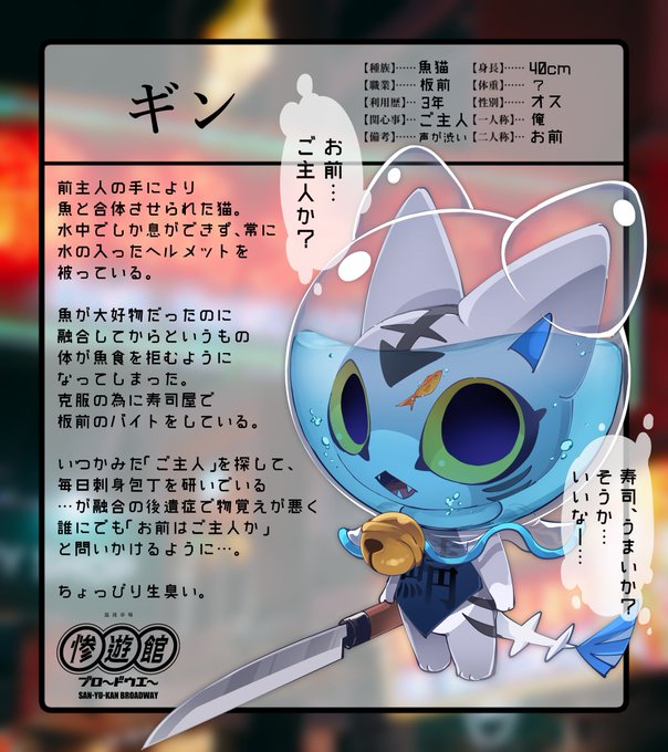 【 @san_yu_kan_BW 】 好きなネタはマグロとカンパチ。 風呂桶が猫ベッド。 爪と柳刃包丁研いで、客の寿司見て涎を垂らす。 報復のギン。 肉は食べられるみたいです。 #惨遊館ブロ〜ドウエ〜_CS