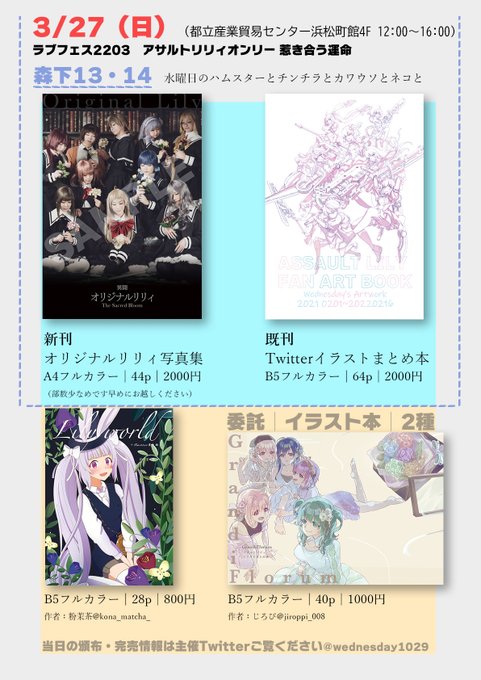 【おしながき】 7/10 アサルトリリィオンリー惹き合う運命7th 松26 百合豚煮込み おしながきです!! アサルトリリィよろづCP百合イラスト&4コマ本が出ます!!初のフルカラー!! 既刊はすべてスタァライトのひかまひ中心本です。 既刊は少部数ですが持っていきます~ #惹き合う運命7th