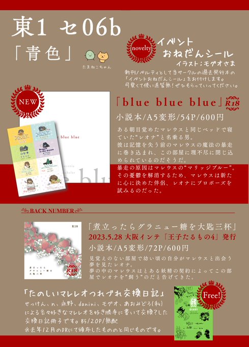 6/25【JUNE BRIDE FES 2023】 おしながき 東1ホール ア19b QQaid ねこやまさんのスペースで マレレオ新刊の委託をお願いできることになりました! よろしくお願いします!! (せっけんはいたりいなかったりになると思います) #愛しの気怠げ王子様