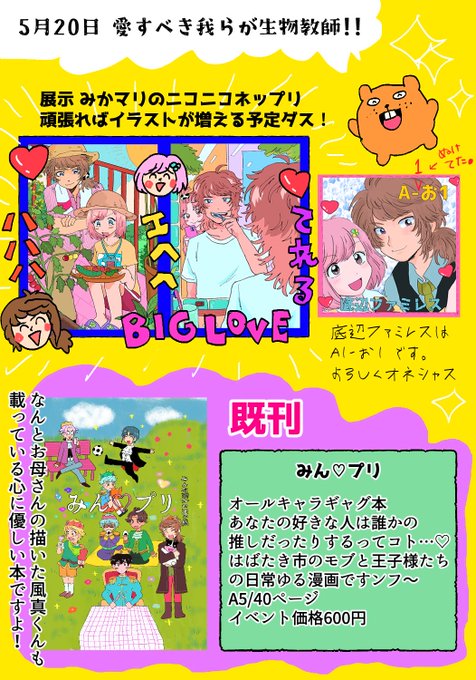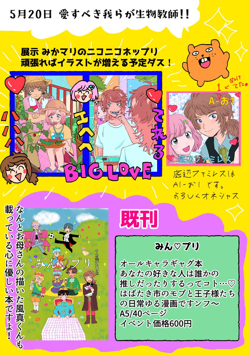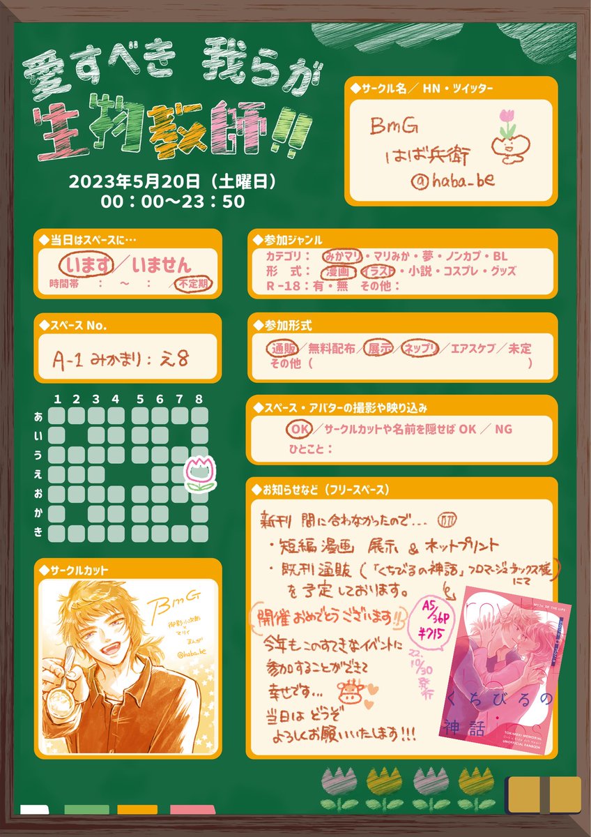 5/20の御影先生オンリー #愛すべき我らが生物教師2 にサークル参加します🌷 素敵な参加表明シートをお借りしたので、サークルカットと併せて投稿します✨ 描きおろしのみかマリイラストの展示&ネップリを予定していますので、お気軽にお立寄りいただけたら嬉しいです🥐✨