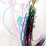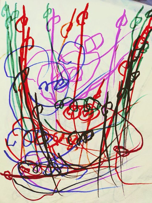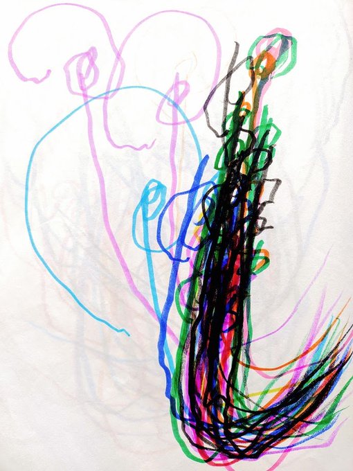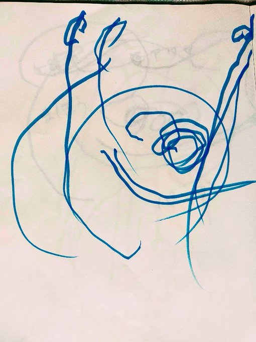#愛の礫 #今月描いた絵を晒そう #寝る前の耕也とのおはなし #耕也の絵 №367 じゃあね№257 私:じゃあね。ぐるぐるしてまぜまぜするとニコニコするものなーんだ? 耕:とけい 私:そうだねー。時計の針はぐるぐる回ってあっちの時間こっちの時間と混ざっちゃうよね。