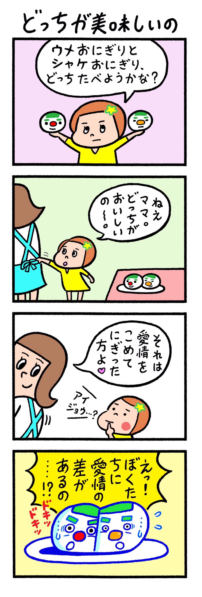 家で握るおにぎりは、昆布と梅とオカカが多いです。コンビニで買うときはツナマヨかなぁ♪ #漫画が読めるハッシュタグ #4コマ漫画 #オリキャラ #おにぎり #愛情 #みんなで楽しむTwitter展覧会 #アトリエの系譜